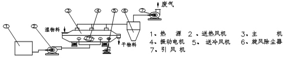 振動流化床干燥機是由振動電機產(chǎn)生的激振力使干燥機振動,物料在一定方向的激振力的作用下跳躍前進(jìn),同時從干燥機底部輸入的熱風(fēng)使物料處于流化狀態(tài),物料顆粒與熱風(fēng)充分接觸,進(jìn)行劇烈的傳熱傳質(zhì)過程,此時熱效率最高,上腔處于微負(fù)壓狀態(tài),濕空氣由引風(fēng)機引出,干物料由排料口連續(xù)排出,從而達(dá)到理想的干燥效果。若從振動流化床底部鼓入冷空氣或濕空氣,可達(dá)到冷卻、增濕作用。其原理示意圖如下: